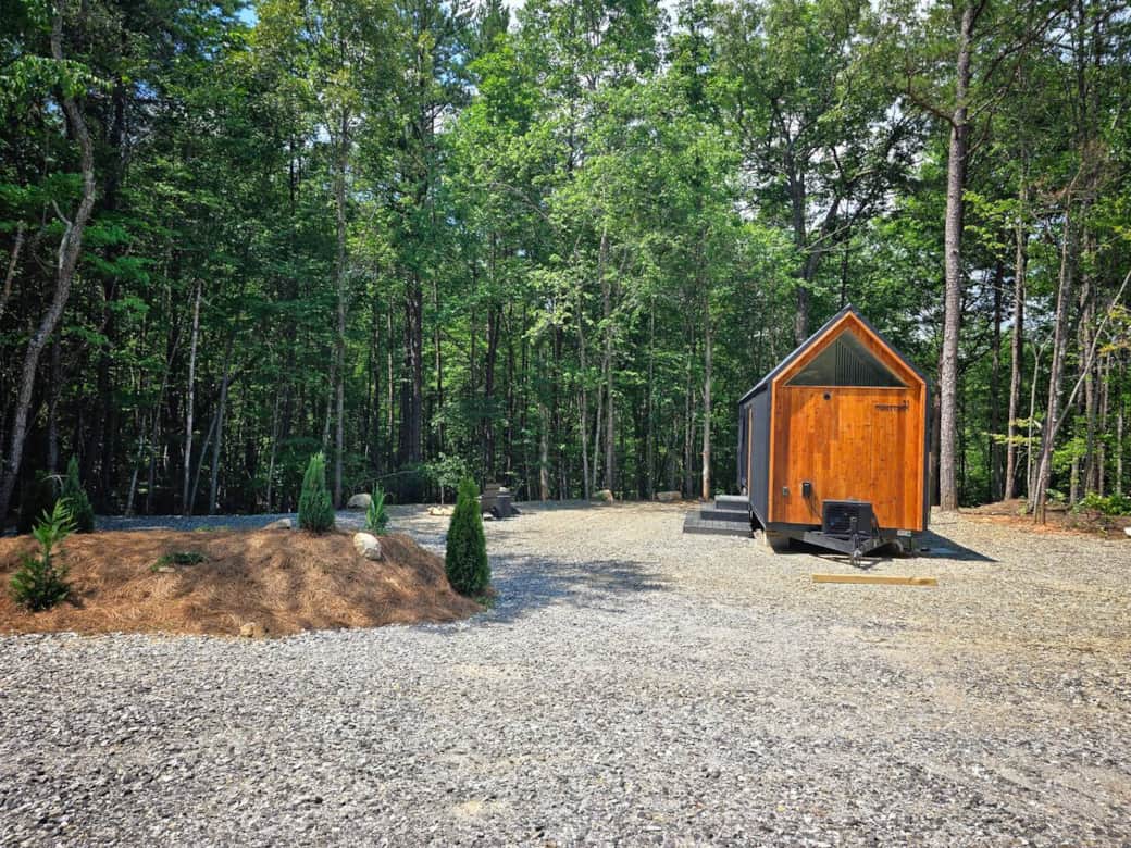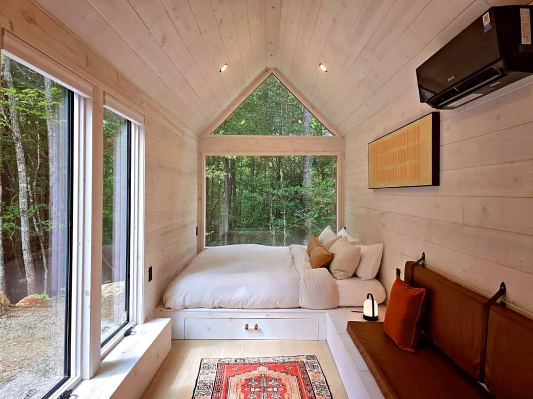 Maple Cabin is a Scandinavian-inspired tiny home tucked on 40 private acres in the Blue Ridge Mountains, between Blue Ridge and Blairsville. With cathedral ceilings, modern design, and picture windows framing the forest, it’s made for rest and comfort. Wander wooded and creekside trails, relax in the barrel sauna, or gather by the fire pit under a starry sky.