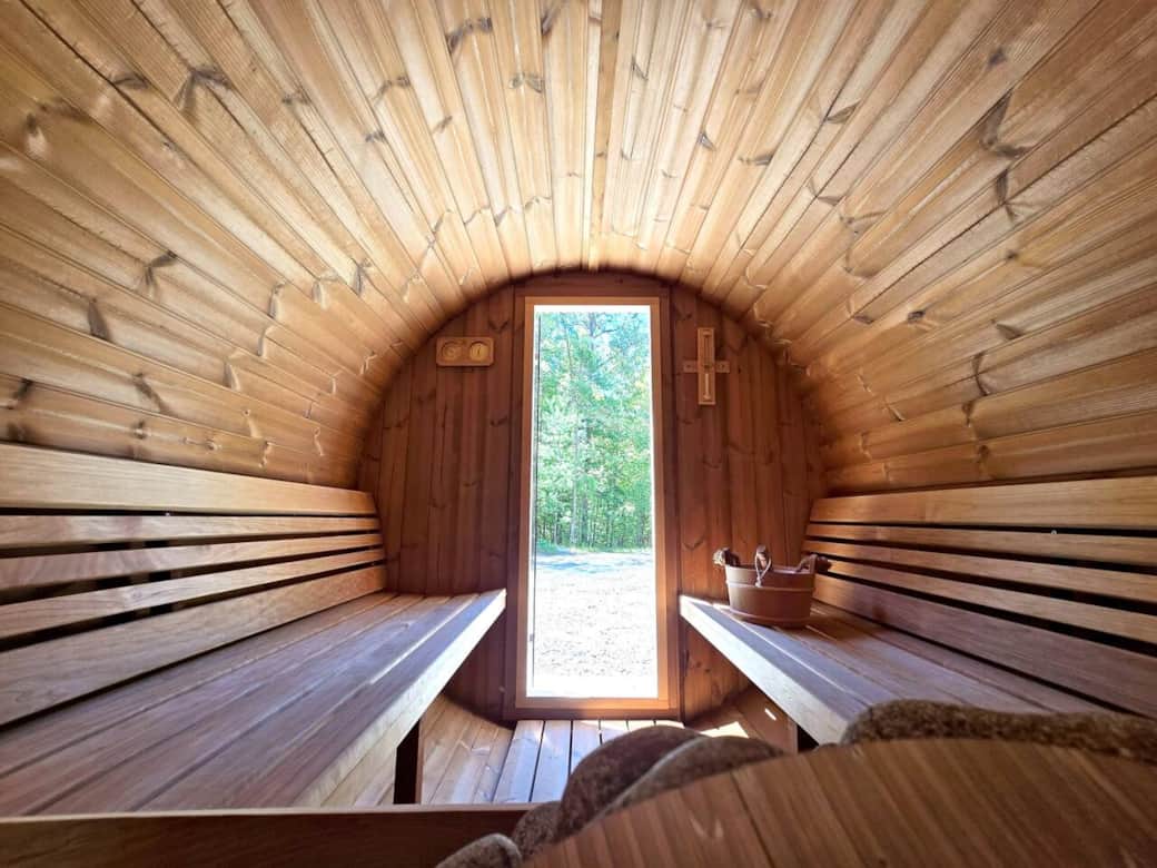 Just outside, your private patio area has a fire pit, two Adirondack chairs, a grill and a dining space. From here, it’s just steps to our forest trails and creekside paths. Guests also have access to the outdoor spa area with a 6-person barrel sauna and a cold shower under the stars.